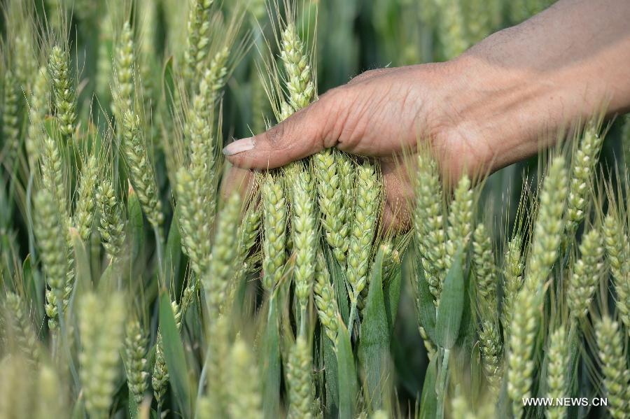 Farmer Chen Zhanyi examines ripe wheat in Wusi Village of Xingtai City, north China's Hebei Province, May 21, 2014. A total of 35.61 million mu (2.374 million hectares) of wheat fields here are going to enter into the harvest season. (Xinhua/Zhu Xudong) |