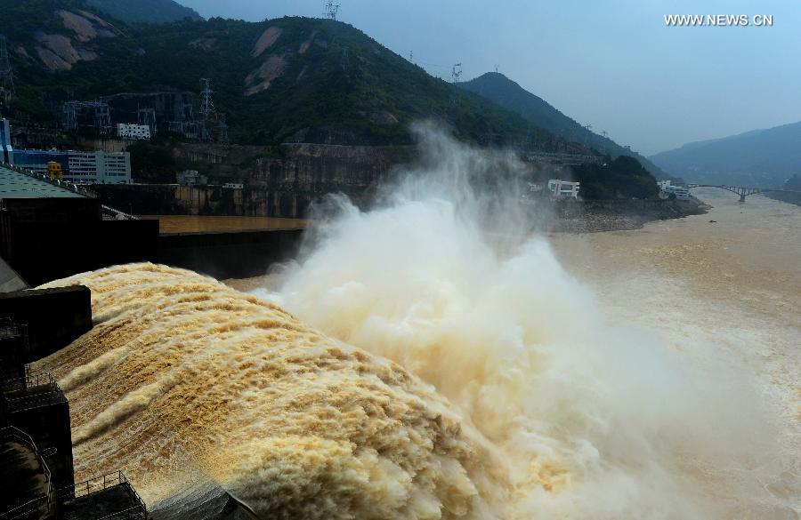 Water gushes from gates of Shuikou Hydropower Station in Minqing County, southeast China's Fujian Province, May 21, 2014. The persisting rainstorm pushed up water level here and the hydropower station had to released flood water. (Xinhua/Wei Peiquan) |