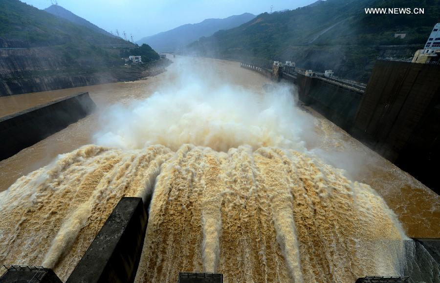 Water gushes from gates of Shuikou Hydropower Station in Minqing County, southeast China's Fujian Province, May 21, 2014. The persisting rainstorm pushed up water level here and the hydropower station had to released flood water. (Xinhua/Wei Peiquan)