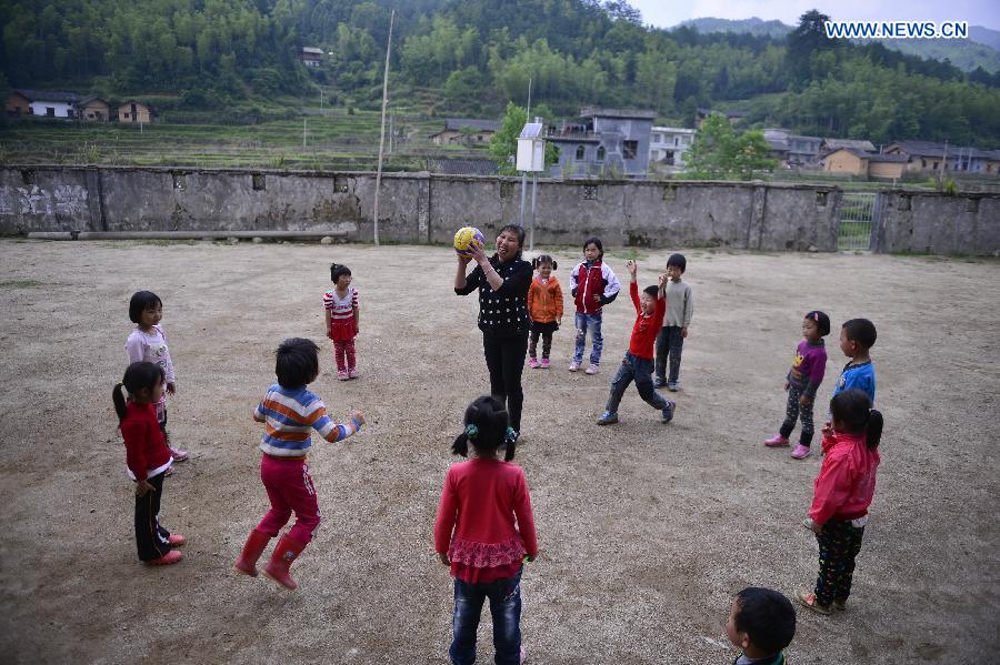 A teacher plays ball game with students at Liyuan Elementary School in Xikeng Village under Wanzai County of Yichun, east China's Jiangxi Province, May 20, 2014. The lack of trained teachers has been a ubiquitous problem that bothers many elementary schools in rural China. Education authorities of Wanzai County have launched a five-year teacher training program in 2014 to address the demand for teachers in the county's rural areas. Each year, the program will receive 30 junior high applicants who are from rural areas. Half of the applicants are required to work in rural schools when they finish the program. (Xinhua/Zhou Mi)
