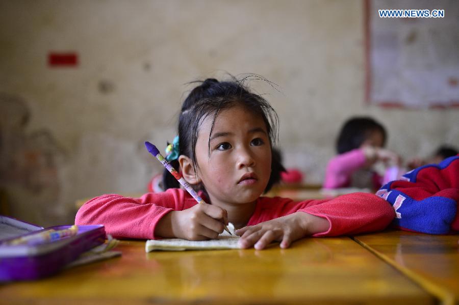 A student listens to a class lecture at Liyuan Elementary School in Xikeng Village under Wanzai County of Yichun, east China's Jiangxi Province, May 20, 2014. The lack of trained teachers has been a ubiquitous problem that bothers many elementary schools in rural China. Education authorities of Wanzai County have launched a five-year teacher training program in 2014 to address the demand for teachers in the county's rural areas. Each year, the program will receive 30 junior high applicants who are from rural areas. Half of the applicants are required to work in rural schools when they finish the program. (Xinhua/Zhou Mi) |
