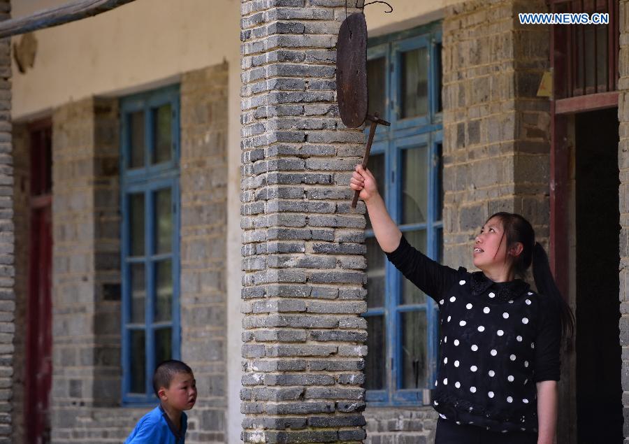 A teacher strikes an iron school bell at Liyuan Elementary School in Xikeng Village under Wanzai County of Yichun, east China's Jiangxi Province, May 20, 2014. The lack of trained teachers has been a ubiquitous problem that bothers many elementary schools in rural China. Education authorities of Wanzai County have launched a five-year teacher training program in 2014 to address the demand for teachers in the county's rural areas. Each year, the program will receive 30 junior high applicants who are from rural areas. Half of the applicants are required to work in rural schools when they finish the program. (Xinhua/Zhou Mi) |