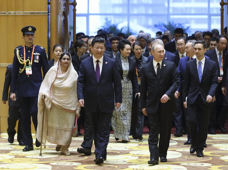 Chinese President Xi Jinping, his wife Peng Liyuan and guests attending the fourth summit of the Conference on Interaction and Confidence Building Measures in Asia (CICA) enter a banquet hall at the Shanghai International Conference Centre in Shanghai, May 20, 2014. Xi held a welcome banquet for guests attending the 4th CICA summit. (Xinhua/Lan Hongguang) |