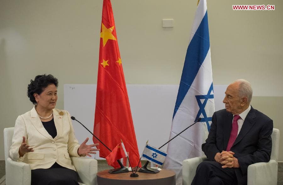 Chinese Vice Premier Liu Yandong (L) meets with Israeli President Shimon Peres in Tel Aviv, Israel, on May 20, 2014. (Xinhua/Li Rui)