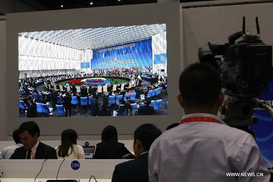 Journalists work at a media center of the fourth summit of the Conference on Interaction and Confidence Building Measures in Asia (CICA) in east China's Shanghai, May 21, 2014. The fourth CICA summit began in Shanghai on Wednesday morning. (Xinhua/Zhang Yuwei) |