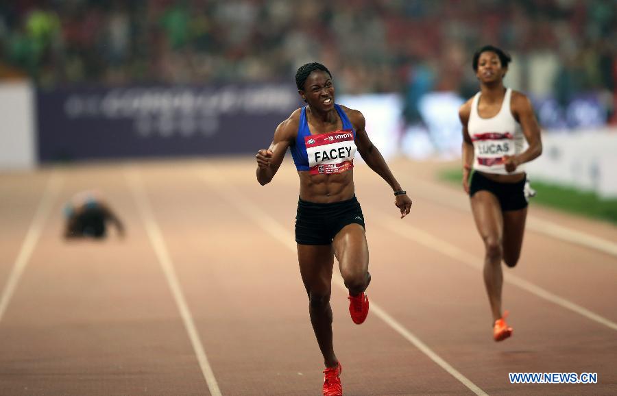 Simone Facey of Jamaica competes during the women's 200 meters at the IAAF World Challenge Beijing, China, May 21, 2014. Simone Facey finished the match in 22.67 seconds and claimed the title. (Xinhua/Bai Xuefei)