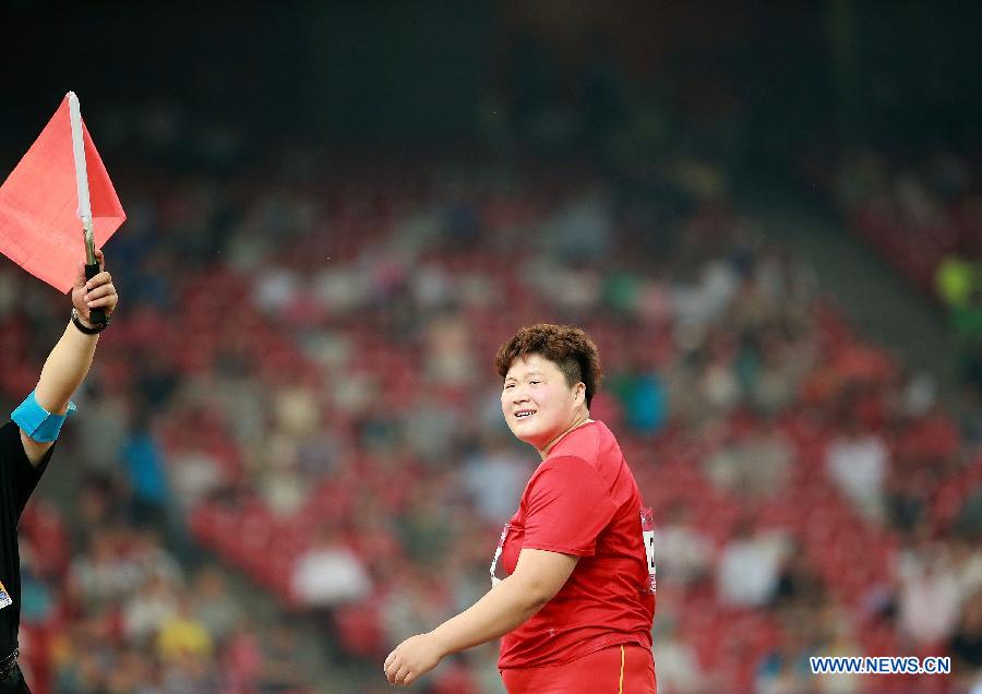 Gong Lijiao of China reacts during the women's shot put at the IAAF World Challenge Beijing, China, May 21, 2014. Gong Lijiao took the second place of the event with 19.61m. (Xinhua/Li Ming)