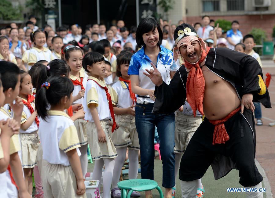 A Peking opera actor interacts with pupils during an event "Peking Opera Comes to Campus" at Haojiaxiang Elementary School in Xi'an, capital of north China's Shaanxi Province, May 22, 2014. (Xinhua/Li Yibo)