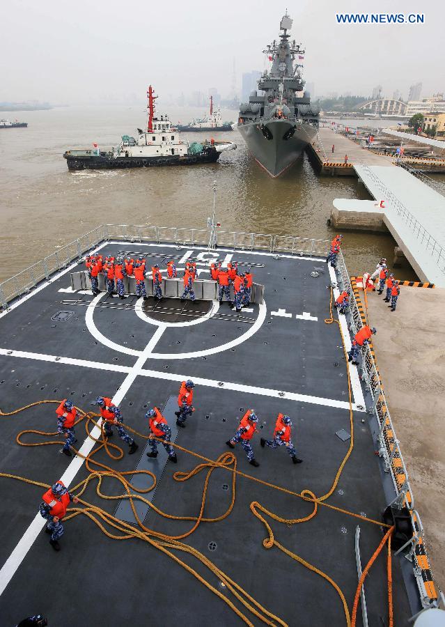China's Zhengzhou missile destroyer (bottom) leaves a military harbor in Shanghai, east China, May 22, 2014. Naval ships from China and Russia left Shanghai for the East China Sea to take part in the "Joint Sea-2014" exercise on Thursday. (Xinhua/Zha Chunming) |