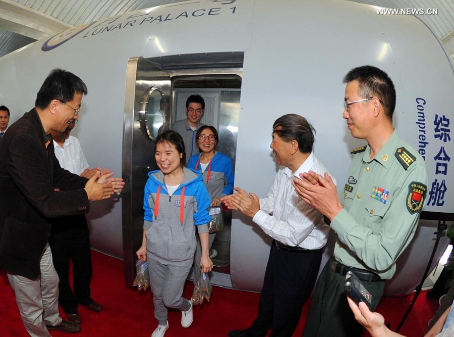 Captain Xie Beizhen (front) and crew members Wang Minjuan (C) and Dong Chen (rear) leave the closed lab after their 105-day sojourn. (Xinhua/Gong Lei)