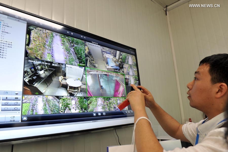 A staff member explains the interior of the Moon Palace 1 on a series of monitors. (Xinhua/Gong Lei)