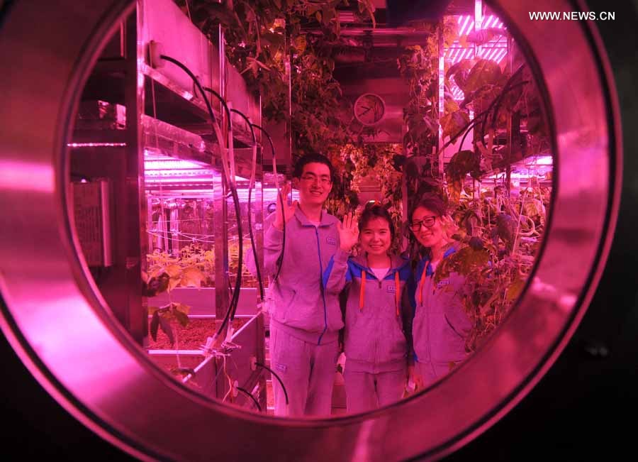 Beijing, May 20, 2014 - Moon Palace 1 Captain Xie Beizhen(C) and crew members Wang Minjuan (R) and Dong Chen (L) pose for photos in front of the vessel's plant cultivation chamber. The three Chinese volunteers were ending an experiment that saw them spend 105 days in an enclosed capsule, eating only laboratory-grown plants and insects. This was China's first manned test of the Moon Palace 1, a 500-cubic meter module that is China's first and the world's third bio-regenerative life support base. (Xinhua/Gong Lei)