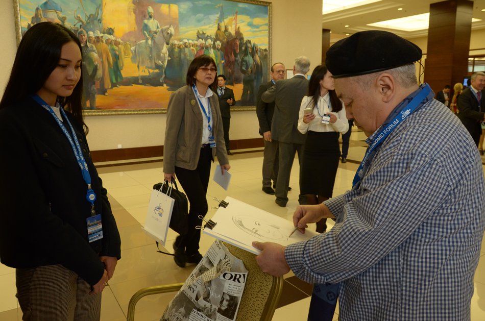 A painter draws a portrait for a participant at the VII Astana Economic Forum. (People's Daily Online/ Yao Chun)