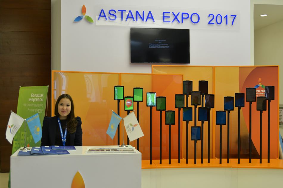 A booth that exhibits the Astana Expo 2017. (People's Daily Online/ Yao Chun)