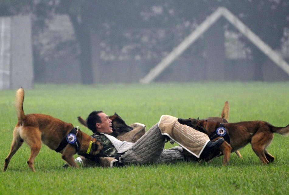 82 police dogs from across the country compete in a canine combat skill competition with their trainer in Foshan, Guangzhou province on May 20, 2014. The three-day-long competition contained seven games for different kinds of police dogs. (Photo/ Guangzhou Daily) |