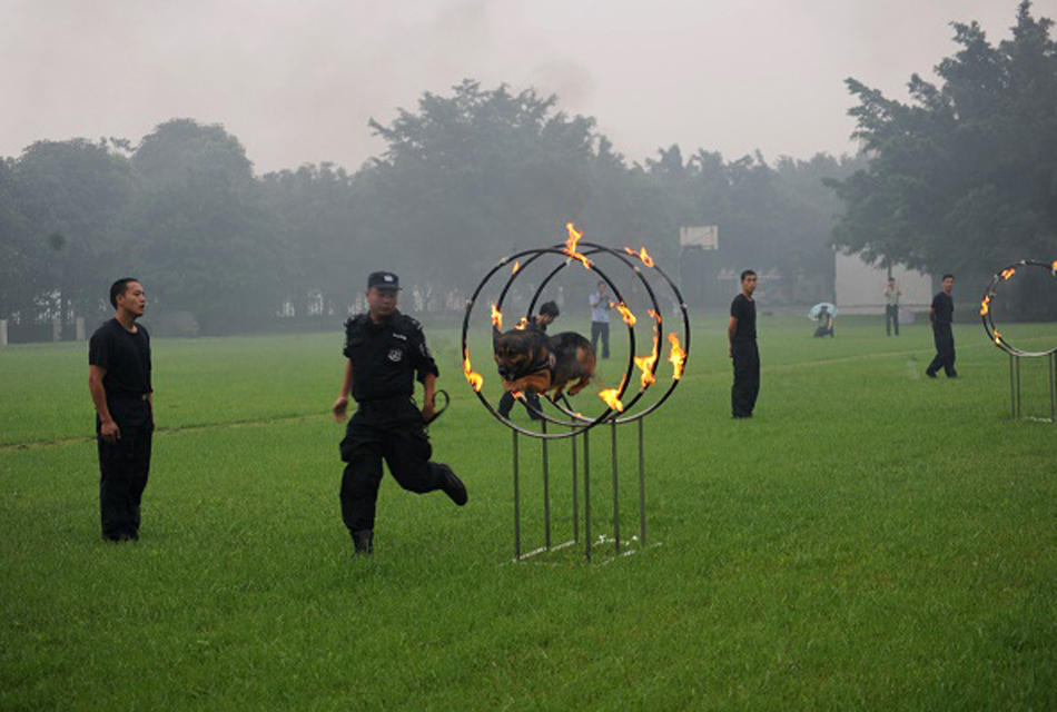 82 police dogs from across the country compete in a canine combat skill competition with their trainer in Foshan, Guangzhou province on May 20, 2014. The three-day-long competition contained seven games for different kinds of police dogs. (Photo/ Guangzhou Daily) |