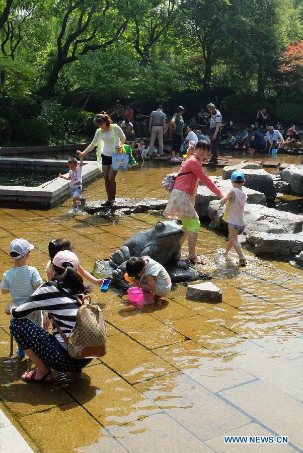 Citizens enjoy themselves at Wulongtan Park in Jinan, capital of east China's Shandong Province, May 22, 2014. A high temperature reaching over 35 Celsius degrees hit the city on Thursday. (Xinhua/Xu Suhui)