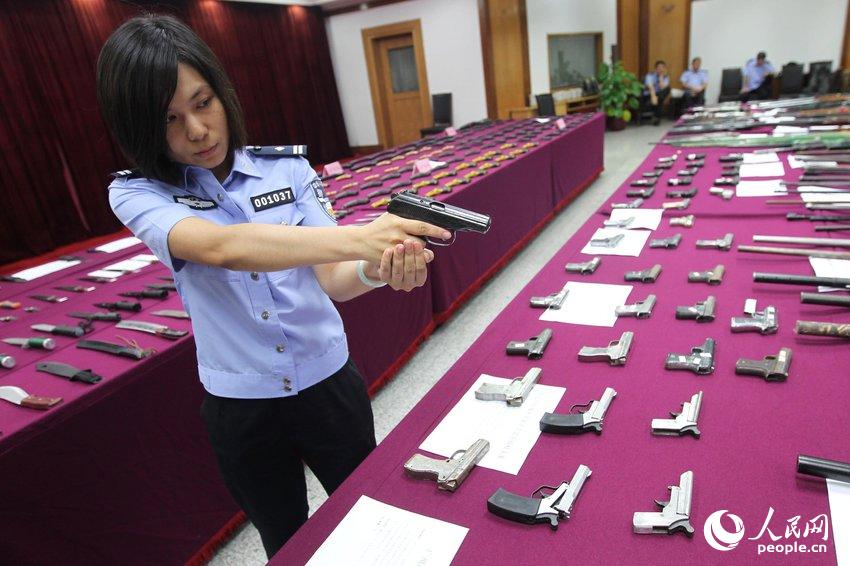 From January to May 20, Guangdong police has solved 338 cases involving firearms, up 7.3 percent year-on-year and arrested 232 online gun-related fugitives, up 52.6 percent, Guangdong Public Security Department announced on Thursday. Over the past six months, a total of 845 guns, 11,093 rounds of ammunition and 77,393 kilograms of explosives, 9,130 detonators and 316,000 replica guns were confiscated. (People's Daily Online Photo)