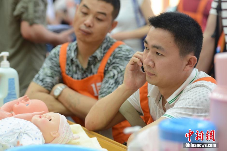 A total of 40 new and expectant fathers attend the super daddy training camp at Hunan Children's Hospital in Changsha, central China's Hunan province, May 23, 1014. They would learn baby nurturing skills in a short time under the guidance of paediatricians, including how to feed, bathe and swaddle babies and change loaded diapers.(Chinanews/Yang Huafeng)