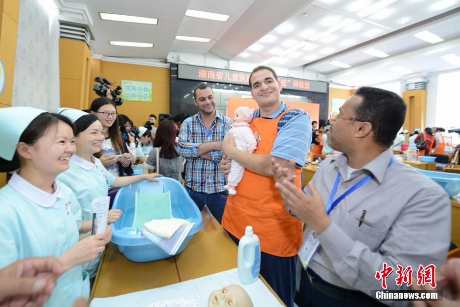 A total of 40 new and expectant fathers attend the super daddy training camp at Hunan Children's Hospital in Changsha, central China's Hunan province, May 23, 1014. They would learn baby nurturing skills in a short time under the guidance of paediatricians, including how to feed, bathe and swaddle babies and change loaded diapers.(Chinanews/Yang Huafeng)