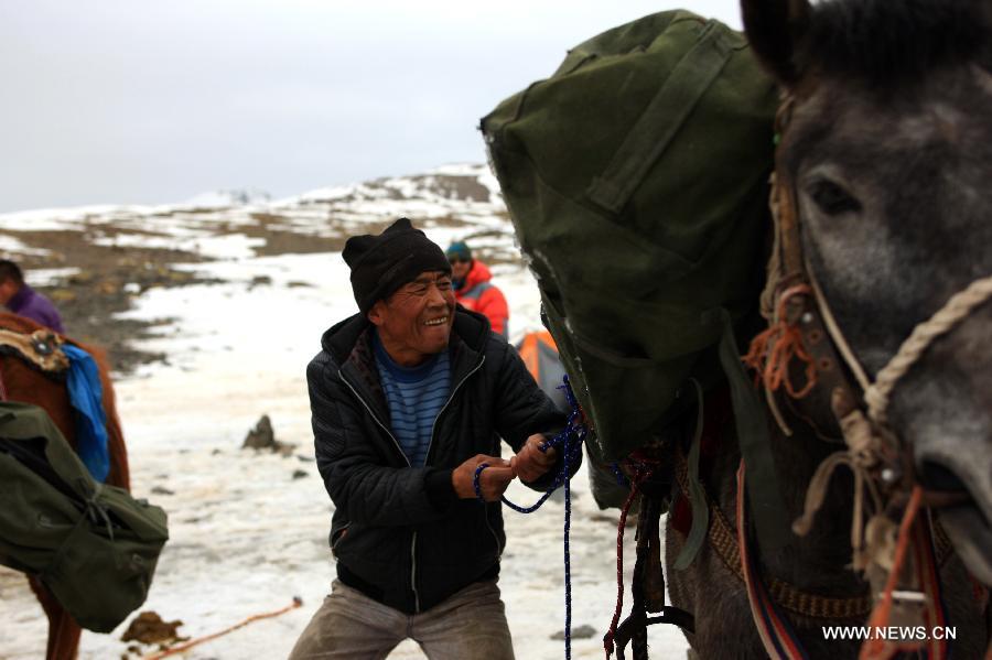 A packhorse owner loads travellers' redundant supplies and garbages at the Gangshika base camp in the Qilian Mountains in Menyuan County, northwest China's Qinghai Province, May 22, 2014. In recent years, Gangshika, the main peak of the Qilian Mountains, has become a destination for a growing number of travellers. In the nearby village of Shangdiaogou, villagers are grasping a business opportunity by providing the mountain travellers with packhorse services. In each journey, the packhorse team will carry travellers's supplies to a base camp at over 4000 meters in elevation, and bring back redundant supplies as well as garbages. (Xinhua/Guo Qiuda)