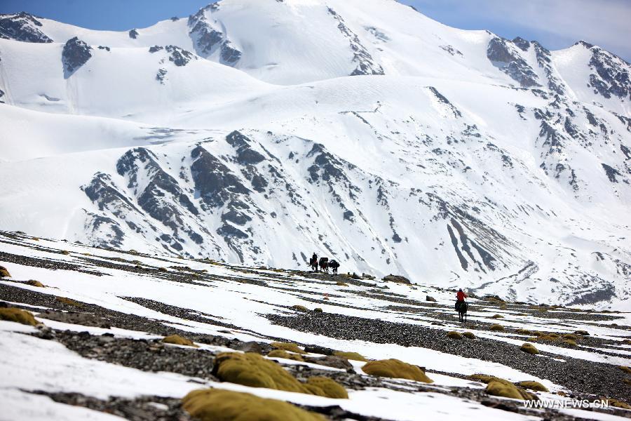 A packhorse team makes its way towards the Gangshika base camp in the Qilian Mountains in Menyuan County, northwest China's Qinghai Province, May 20, 2014. In recent years, Gangshika, the main peak of the Qilian Mountains, has become a destination for a growing number of travellers. In the nearby village of Shangdiaogou, villagers are grasping a business opportunity by providing the mountain travellers with packhorse services. In each journey, the packhorse team will carry travellers's supplies to a base camp at over 4000 meters in elevation, and bring back redundant supplies as well as garbages. (Xinhua/Guo Qiuda)