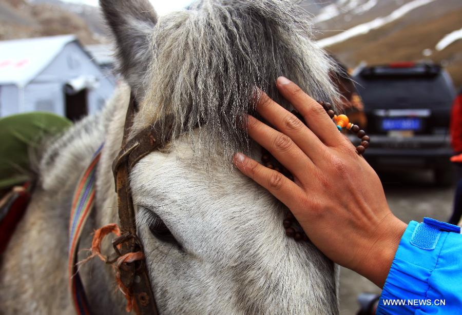 A mountain hiker prays for a packhorse at a transit camp in the Qilian Mountains in Menyuan County, northwest China's Qinghai Province, May 22, 2014. In recent years, Gangshika, the main peak of the Qilian Mountains, has become a destination for a growing number of travellers. In the nearby village of Shangdiaogou, villagers are grasping a business opportunity by providing the mountain travellers with packhorse services. In each journey, the packhorse team will carry travellers's supplies to a base camp at over 4000 meters in elevation, and bring back redundant supplies as well as garbages. (Xinhua/Guo Qiuda)
