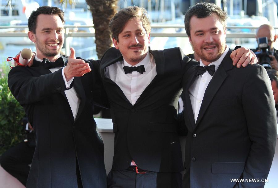 Director Simon Mesa Soto (C) wins Short Films Palme D'or of the 67th Cannes Film Festival for his film Leidi, in Cannes, France, May 24, 2014.(Xinhua/Chen Xiaowei)