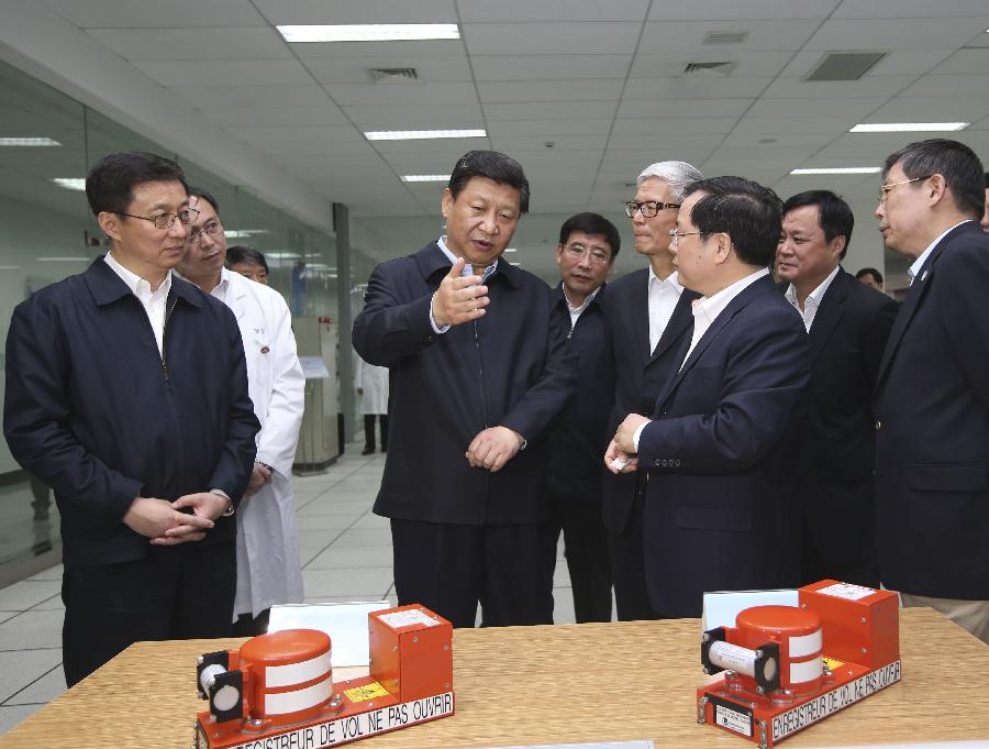 Chinese President Xi Jinping (2nd L) visits the design and research center of Commercial Aircraft Corporation of China (COMAC) during his inspection in Shanghai, east China, May 23, 2014. Xi Jinping made an inspection tour to Shanghai from Friday to Saturday. (Xinhua/Lan Hongguang) |
