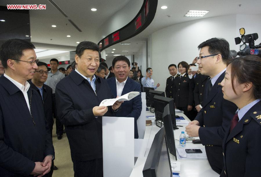 Chinese President Xi Jinping (2nd L) talks with workers at Waigaoqiao comprehensive service hall of the China (Shanghai) Pilot Free Trade Zone (FTZ) during his inspection in Shanghai, east China, May 23, 2014. Xi Jinping made an inspection tour to Shanghai from Friday to Saturday. (Xinhua/Huang Jingwen) |