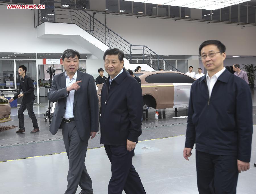 Chinese President Xi Jinping (C) visits the technology center of Shanghai Automotive Industry Corp. (SAIC MOTOR) during his inspection in Shanghai, east China, May 24, 2014. Xi Jinping made an inspection tour to Shanghai from Friday to Saturday. (Xinhua/Lan Hongguang) |