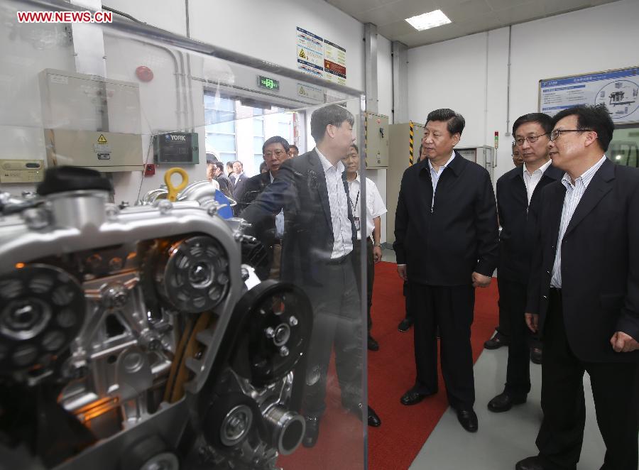 Chinese President Xi Jinping (C) visits the technology center of Shanghai Automotive Industry Corp. (SAIC MOTOR) during his inspection in Shanghai, east China, May 24, 2014. Xi Jinping made an inspection tour to Shanghai from Friday to Saturday. (Xinhua/Lan Hongguang) |