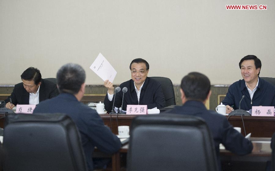 Chinese Premier Li Keqiang (C, back), also a member of the Standing Committee of the Political Bureau of the Communist Party of China (CPC) Central Committee, attends a meeting of the standing members of the local Party committee for the "mass line" educational campaign, in Ongniud Qi, north China's Inner Mongolia Autonomous Region, May 23, 2014. The Communist Party of China (CPC) initiated the year-long campaign in June, 2013 to strengthen the "mass line", referring to a guideline under which the CPC is required to prioritize the interests of the people. (Xinhua/Xie Huanchi) |