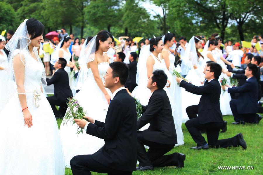 Lovers take part in a group wedding ceremony at Aixi Lake Wetland Park in Nanchang, capital of east China's Jiangxi Province, May 25, 2014. About 100 couples took part in the group wedding ceremony in which newlyweds ride bicycles to promote environmental concept. (Xinhua/Zhu Wenbiao) |