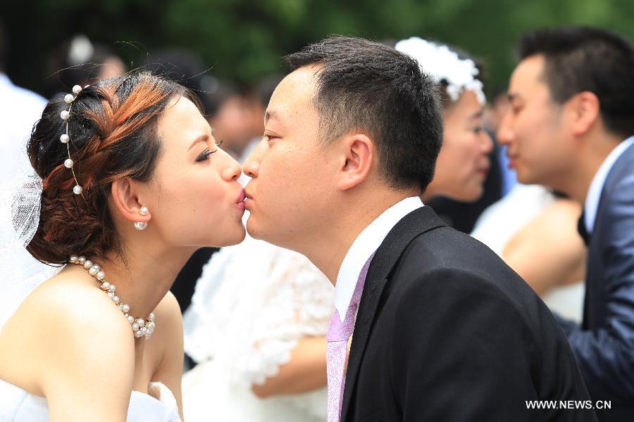 Lovers kiss during a group wedding ceremony at Aixi Lake Wetland Park in Nanchang, capital of east China's Jiangxi Province, May 25, 2014. About 100 couples took part in the group wedding ceremony in which newlyweds ride bicycles to promote environmental concept. (Xinhua/Zhu Wenbiao)