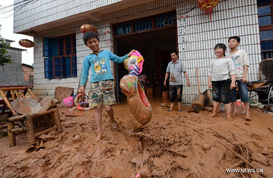 A boy holds his toy after a flood at Chengchong Village in Shangli County, east China's Jiangxi Province, May 25, 2014. Heavy rainstorms hit Shangli since Saturday, causing two deaths and forcing the relocation of around 84,500 people. (Xinhua/Zhou Ke)