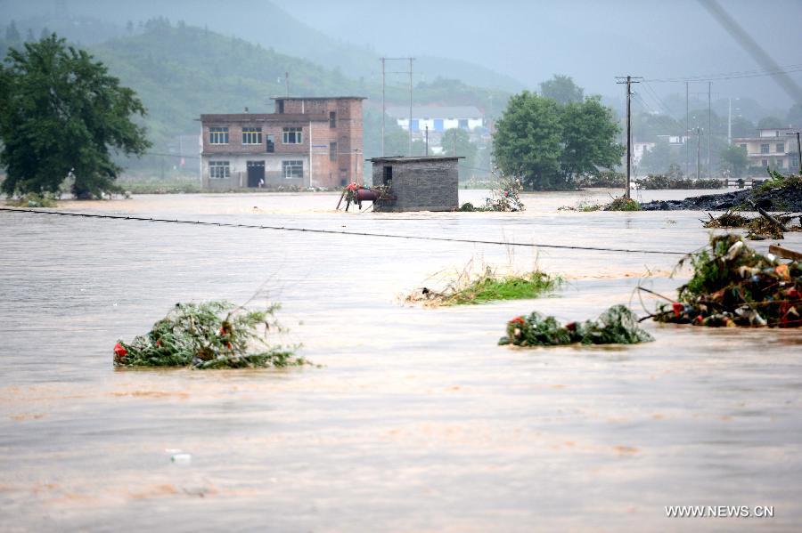 Photo taken on May 25, 2014 shows the flood at Doutian Village in Shangli County, east China's Jiangxi Province, May 25, 2014. Heavy rainstorms hit Shangli since Saturday, causing two deaths and forcing the relocation of around 84,500 people. (Xinhua/Zhou Ke)