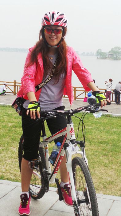 A participant poses for a photo with her bike after the “Climate Race” in Beijing Yeya Lake National Wetland Park in Yanqing north of Beijing on May 24, 2014. (People’s Daily Online/Gao Yinan)