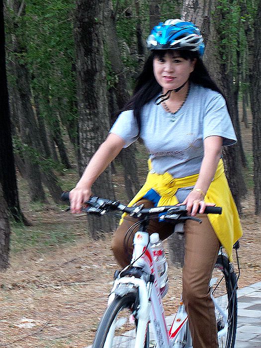 A woman finishes her ride in the “Climate Race ” in Beijing Yeya Lake National Wetland Park in Yanqing north of Beijing on May 24, 2014. (People’s Daily Online/Gao Yinan)