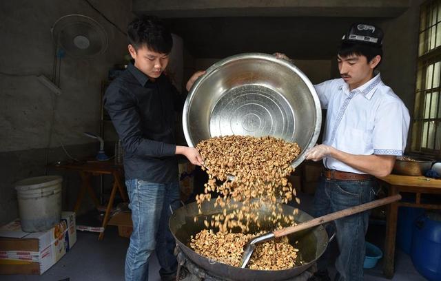 Adili and Jiang Chunyang pour walnuts into a pot of syrup on May 22, 2014. (Xinhua/Li Ga)