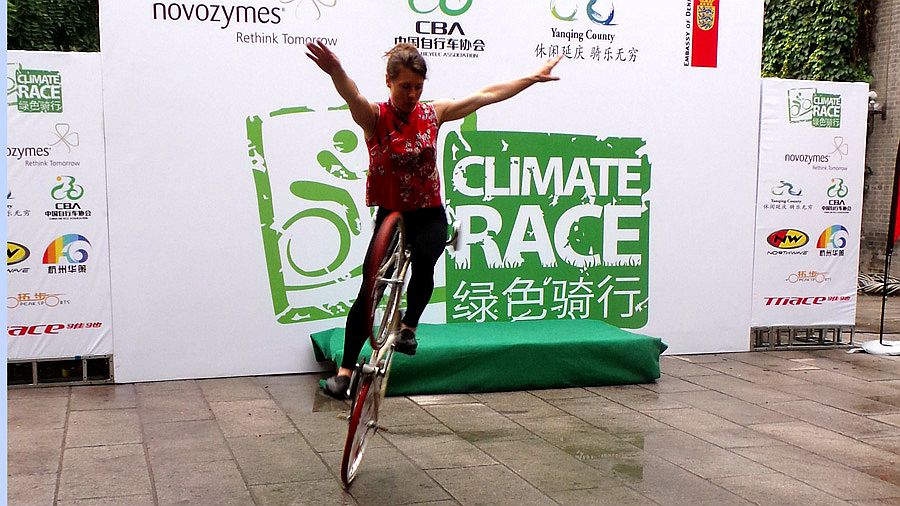 Ines Brunn performs stunts on bike. (People’ Daily Online/ Gao Yinan)