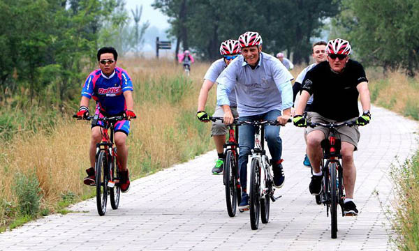 Ambassador Petersen enjoys riding bike in Yeya Lake National Wetland Park in Yanqing County. (People’s Daily Online/Gao Yinan)