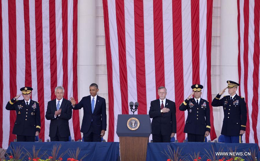 U.S. President Barack Obama (3rd L), Chairman of the Joint Chiefs of Staff Army Martin Dempsey (1st L) and U.S. Secretary of Defense Chuck Hagel (2nd L) attend a Memorial Day event at Arlington National Cemetery, outside Washington D.C., the United States, May 26, 2014. (Xinhua/Yin Bogu)
