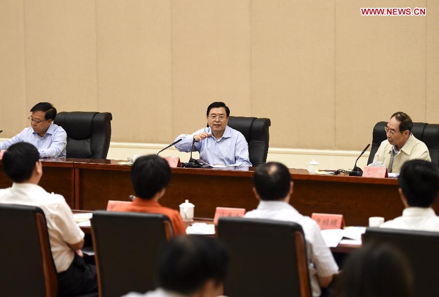 Zhang Dejiang (C, back), chairman of China's National People's Congress (NPC) Standing Committee and a member of the Standing Committee of the Political Bureau of the Communist Party of China (CPC) Central Committee, attends a meeting of the standing members of the local Party committee for the "mass line" educational campaign, in Shanghang County, southeast China's Fujian Province, May 21, 2014. The Communist Party of China (CPC) initiated the year-long campaign in June, 2013 to strengthen the "mass line", referring to a guideline under which the CPC is required to prioritize the interests of the people. (Xinhua/Li Xueren) |