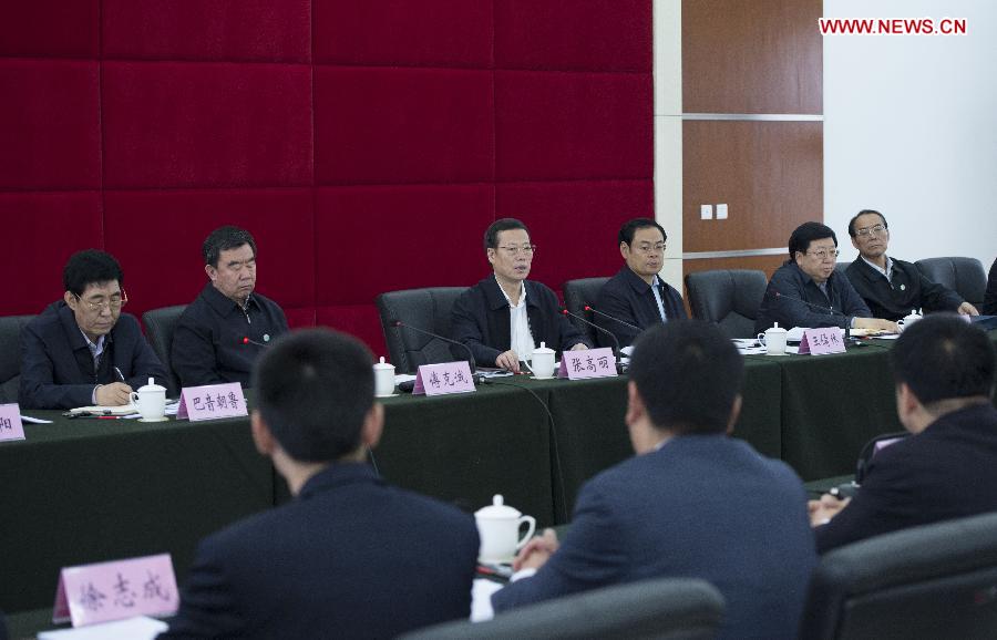 Chinese Vice Premier Zhang Gaoli (C, back), also a member of the Standing Committee of the Political Bureau of the Communist Party of China Central Committee, attends a meeting of the standing members of the local Party committee for the "mass line" educational campaign, in Nongan County, northeast China's Jilin Province, May 19, 2014. The Communist Party of China (CPC) initiated the year-long campaign in June, 2013 to strengthen the "mass line", referring to a guideline under which the CPC is required to prioritize the interests of the people. (Xinhua/Wang Ye) |