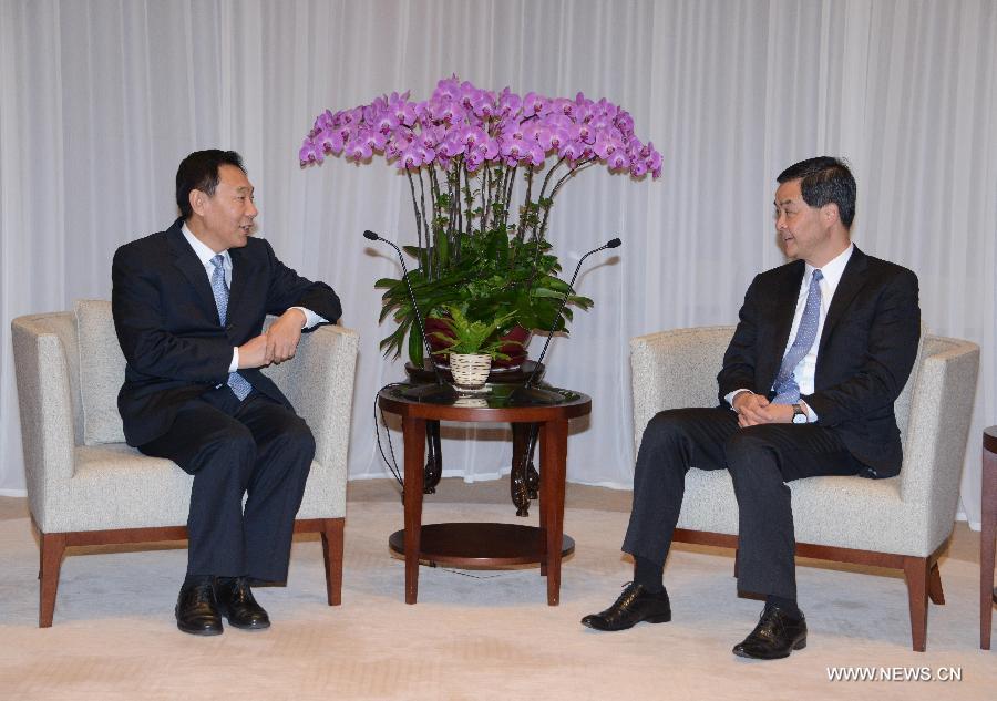 Hong Kong Chief Executive Leung Chun-ying (R) meets with Zhang Yong, head of the China Food and Drug Administration, in Hong Kong, south China, May 26, 2014.(Xinhua)