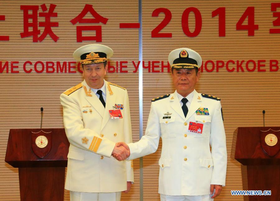 Tian Zhong (R), deputy commander of the Chinese Navy and the Chinese director of the "Joint Sea-2014", shakes hands with Fedotenkov, deputy commander of Russian Navy and Russian director of the drill, at the closing ceremony of the China-Russia joint naval drill in Shanghai, east China, May 26, 2014. The directors of two sides announced the end of the drill here on Monday. (Xinhua/Zha Chunming)
