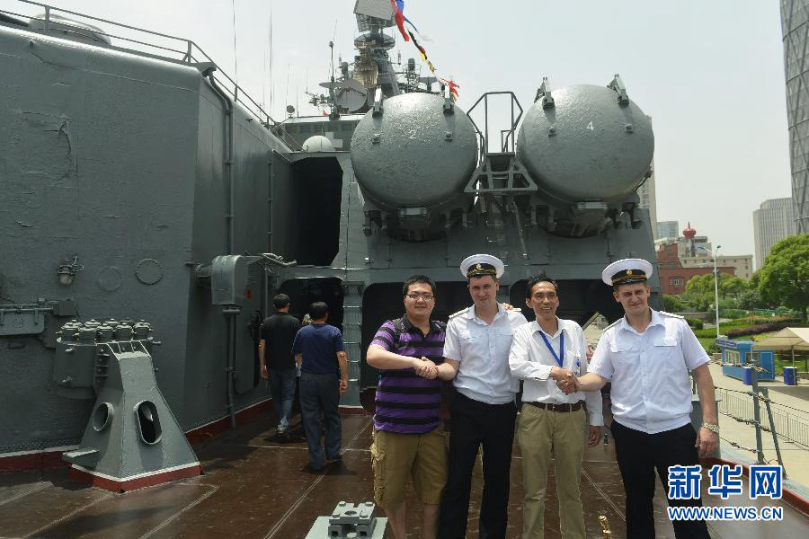 Visitors take photos with Russian crew member on board Russian guided missile cruiser Varyag on May 26, 2014. On Saturday, the Chinese and Russian navies concluded a combat drill in the East China Sea. A total of 14 warships, two submarines, nine airplanes and six helicopters from both sides took part in the three-day drill “Joint Sea-2014”. Chinese battleship Zhengzhou and Russian guided missile cruiser Varyag opened to the public on Monday at a port in Shanghai. (Xinhua News Agency/Long Wei) |