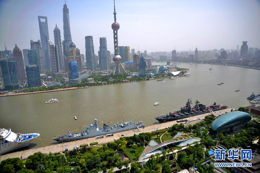 A photo shows Chinese battleship Zhengzhou (L) and Russian guided missile cruiser Varyag (R) at a port in Shanghai on May 26, 2014. (Xinhua News Agency/Long Wei)