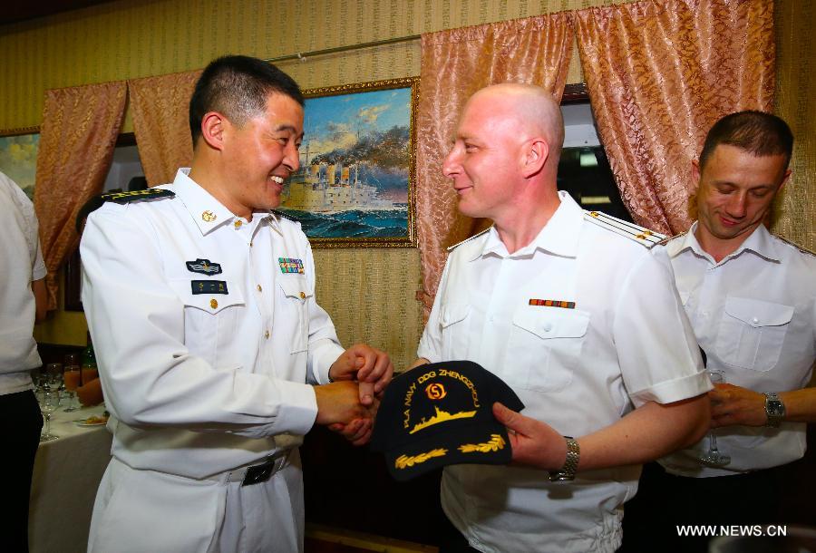 Chinese and Russian officers communicate during a reception held on the Russian guided missile cruiser Varyag in Shanghai, east China, May 19, 2014. Chinese and Russian naval forces held interchange activities on Monday to enhance mutual communication. (Xinhua/Zha Chunming)